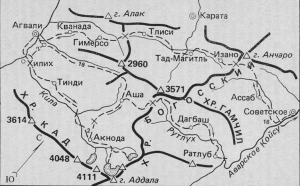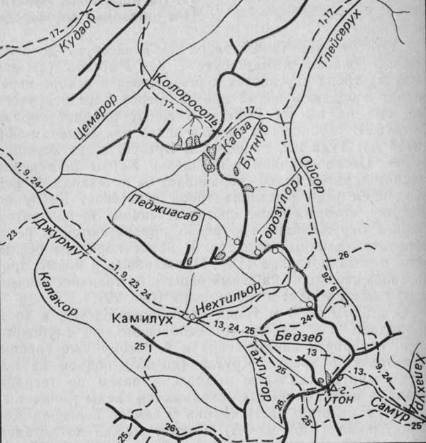 Наконец дорога выходит на склон ущелья Каракойсу и ныряет в глубокий провал к мосту. С подъема на террасу правого берега видны остатки балконного участка дороги на 350-метровом скальном отвесе левого берега. Сохранились вбитые в скалы рельсы, по которым проложены прогоны и поперечины. Проезд по такой дороге всегда вызывал страх у путников. С постройкой в 1976 г. моста и подходов к нему ушла в прошлое эквилибристика на балконе. По пути встречается аул Кулаб. Видны снежные макушки гор и среди них многогребневая Гадваду (2718 м). Дорога бежит высоко над рекой через сады и заросшие кустарником склоны. На пути встречается небольшое поселение Адмигихль, называемое также Бацада-Коммуна. Постепенно по правую руку раскрывается долина реки Каралазургер, а вскоре после спуска к очередному мосту через Каракойсу поднявшаяся вверх дорога раздваивается. Левая ветвь уходит к райцентру Цуриб, а правая—к аулам долины Каралазургер (рис. 24).
