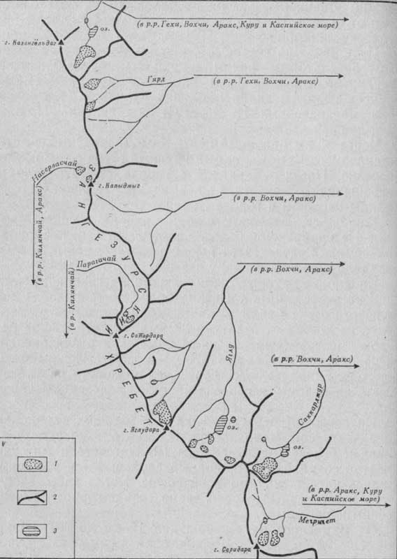 | Схема расположения ледников на Зангезурском хребте: 1 — ледники; 2 — водоразделы; 3 — озера |