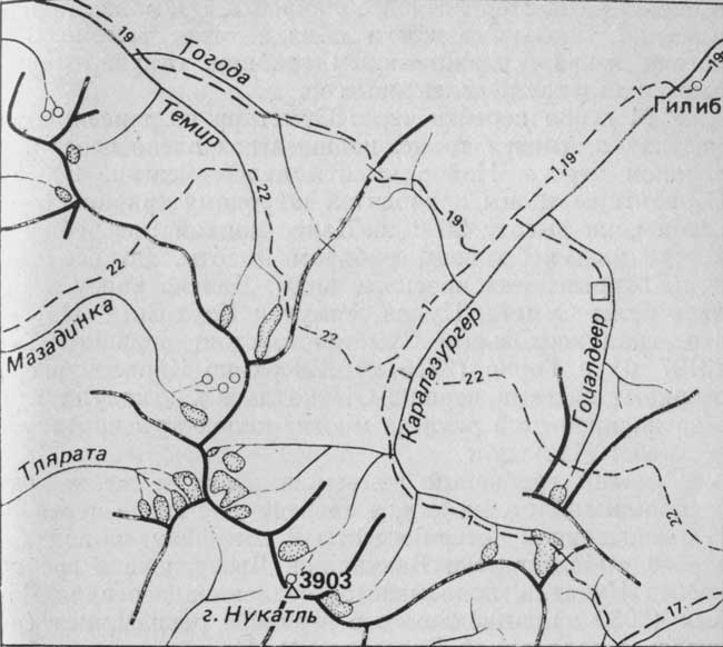 Наконец дорога выходит на склон ущелья Каракойсу и ныряет в глубокий провал к мосту. С подъема на террасу правого берега видны остатки балконного участка дороги на 350-метровом скальном отвесе левого берега. Сохранились вбитые в скалы рельсы, по которым проложены прогоны и поперечины. Проезд по такой дороге всегда вызывал страх у путников. С постройкой в 1976 г. моста и подходов к нему ушла в прошлое эквилибристика на балконе. По пути встречается аул Кулаб. Видны снежные макушки гор и среди них многогребневая Гадваду (2718 м). Дорога бежит высоко над рекой через сады и заросшие кустарником склоны. На пути встречается небольшое поселение Адмигихль, называемое также Бацада-Коммуна. Постепенно по правую руку раскрывается долина реки Каралазургер, а вскоре после спуска к очередному мосту через Каракойсу поднявшаяся вверх дорога раздваивается. Левая ветвь уходит к райцентру Цуриб, а правая—к аулам долины Каралазургер (рис. 24).