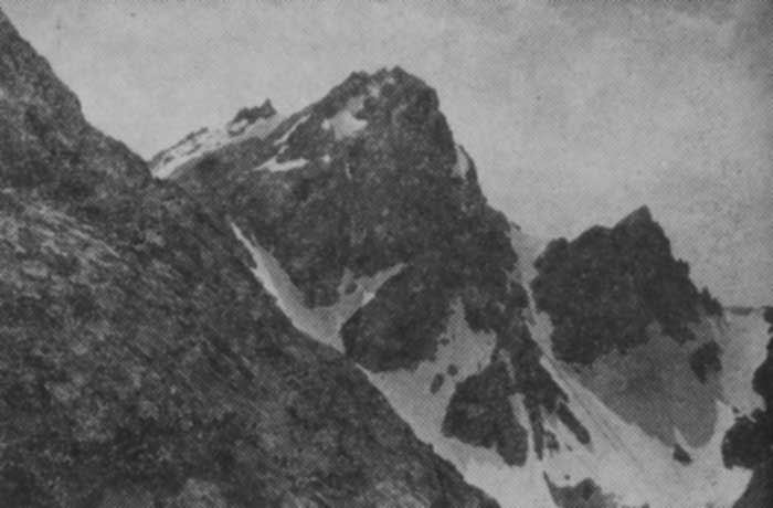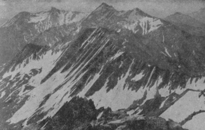 | Северная стена вершины 5-я Юго-западная Чиухи Вид от гребня, идущего к Сланцевой Чиухи. Слева-вверху виден “палец” вершины 4-й Юго-западной Чиухи |