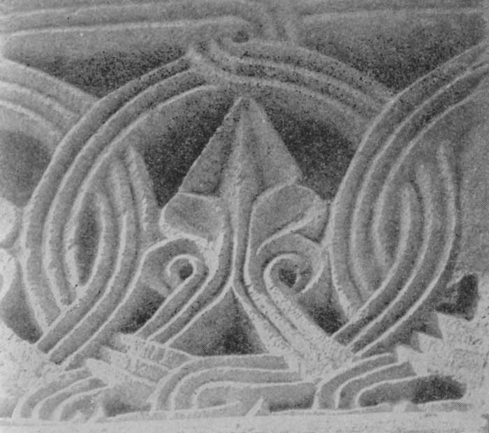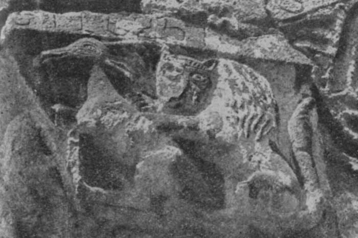 | Лев, задирающий осла. Каменная резьба под карнизом юго-восточного угла средневековой церкви Богородицы в сел. Вале. 7.VIII.1976 г. |